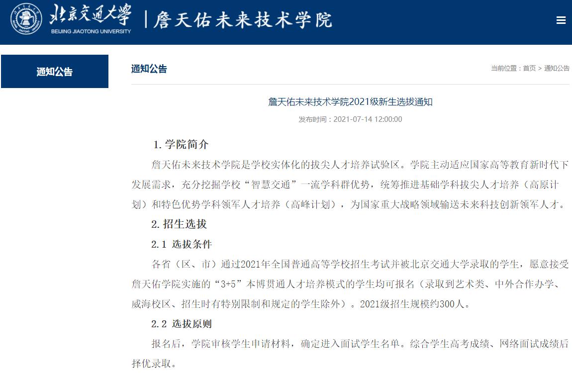 北京交通大学詹天佑学院2021级新生选拔通知