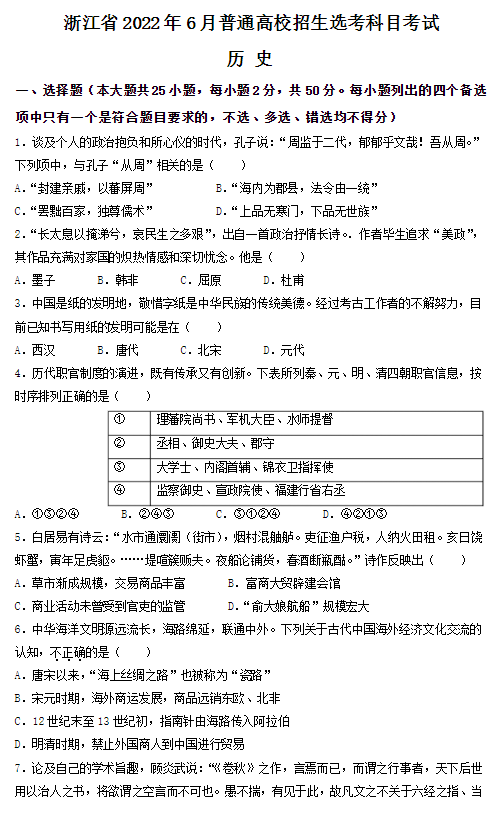 2022年高考浙江卷历史试卷真题