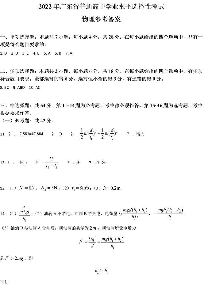 2022年高考广东卷物理试题答案解析