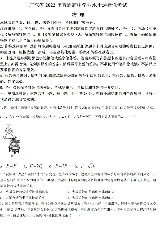 2022年高考广东卷物理真题试卷