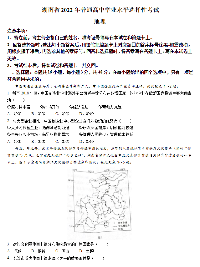 2022年湖南高考地理试卷真题及答案解析(已更新)