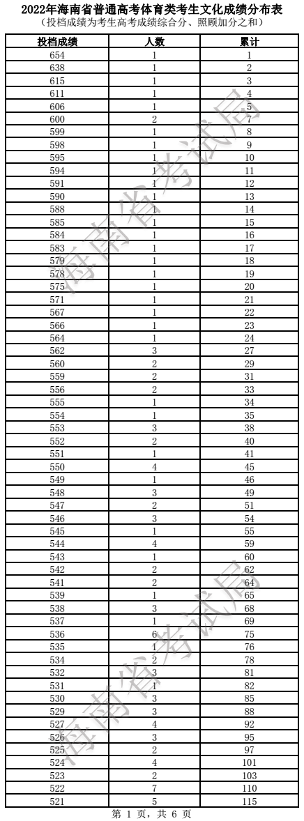 2022年海南高考体育类一分一段统计表及分段排名
