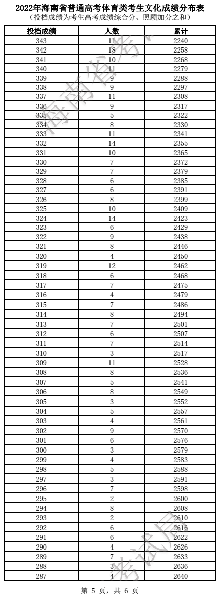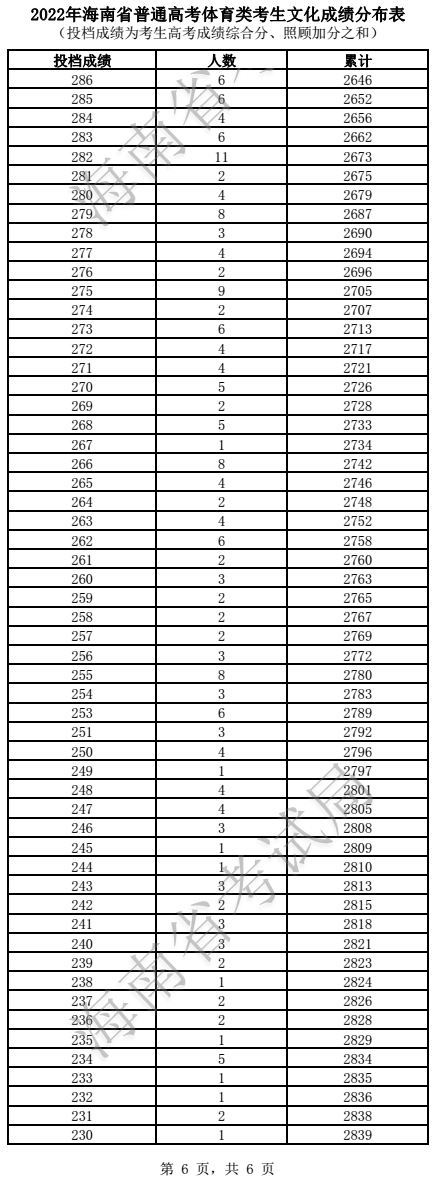 2022年海南高考体育类成绩一分一段统计表