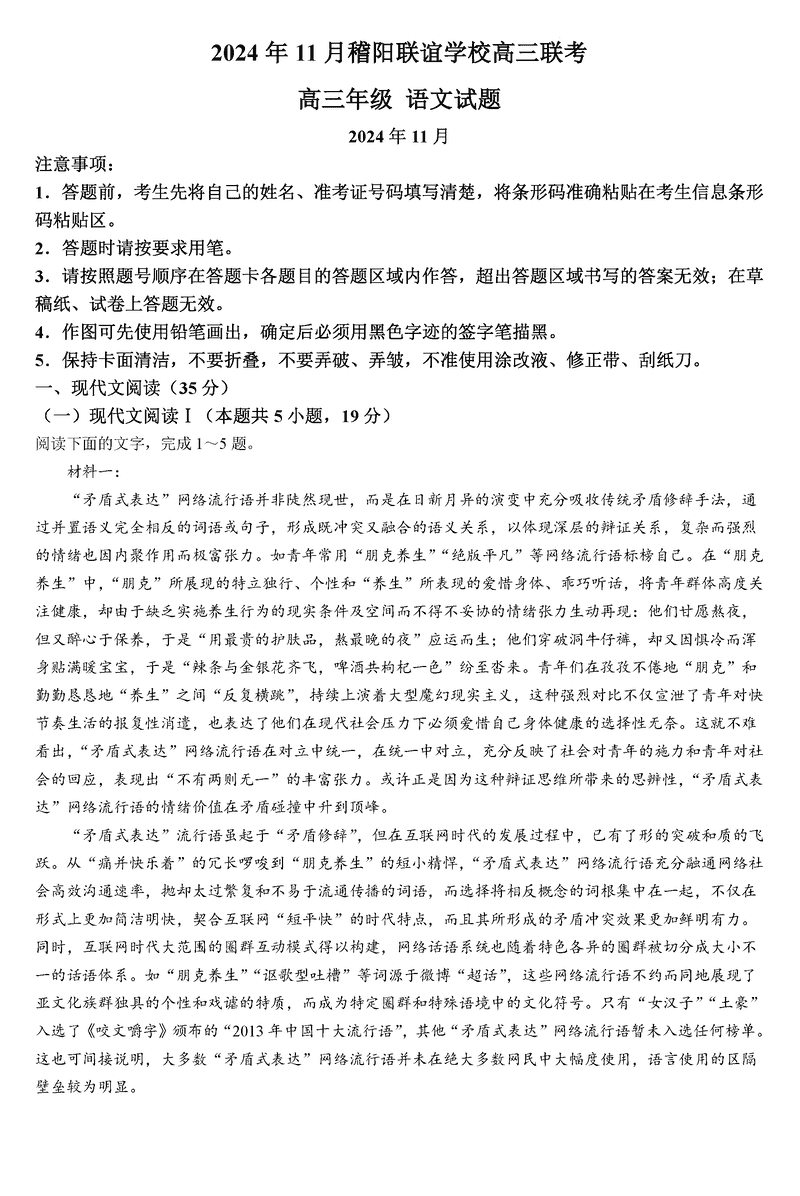 浙江稽阳联谊学校2024年11月高三上学期联考语文试题及答案