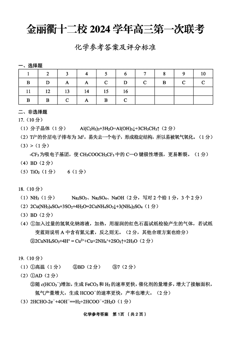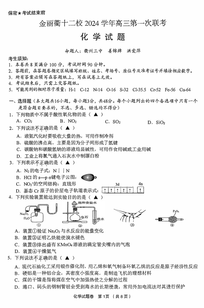金丽衢十二校2024年高三上学期第一次联考化学试题及答案