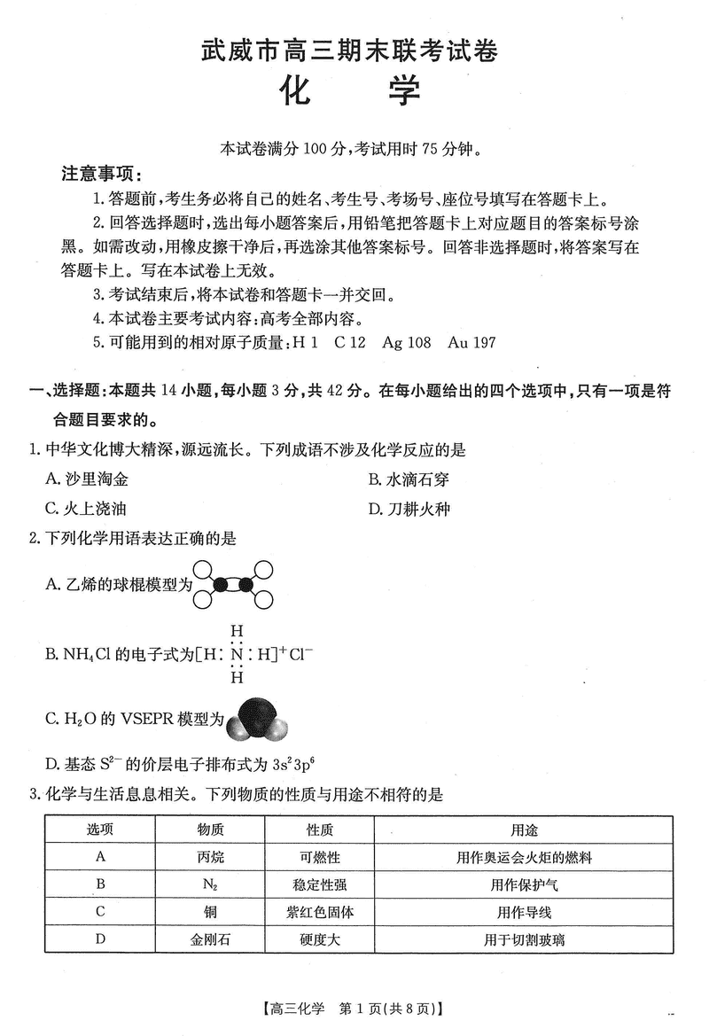 甘肃武威2025届高三上学期1月期末联考化学考试已于近日开考,为方便考生考后及时查看考试情况,查漏补缺、弥补不足,本文整理了试题答案解析相关信息!