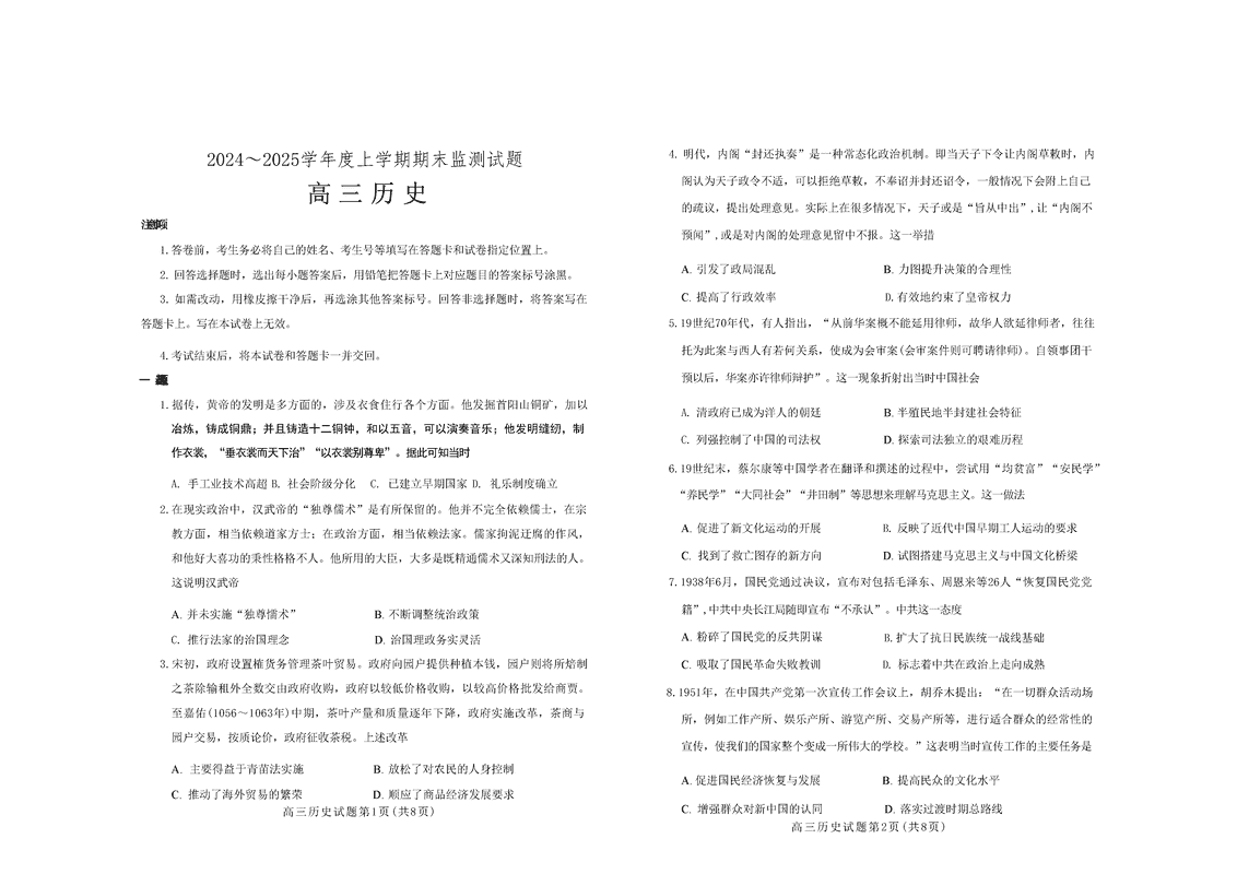 潍坊市、临沂市2025届高三上学期期末历史试题及答案