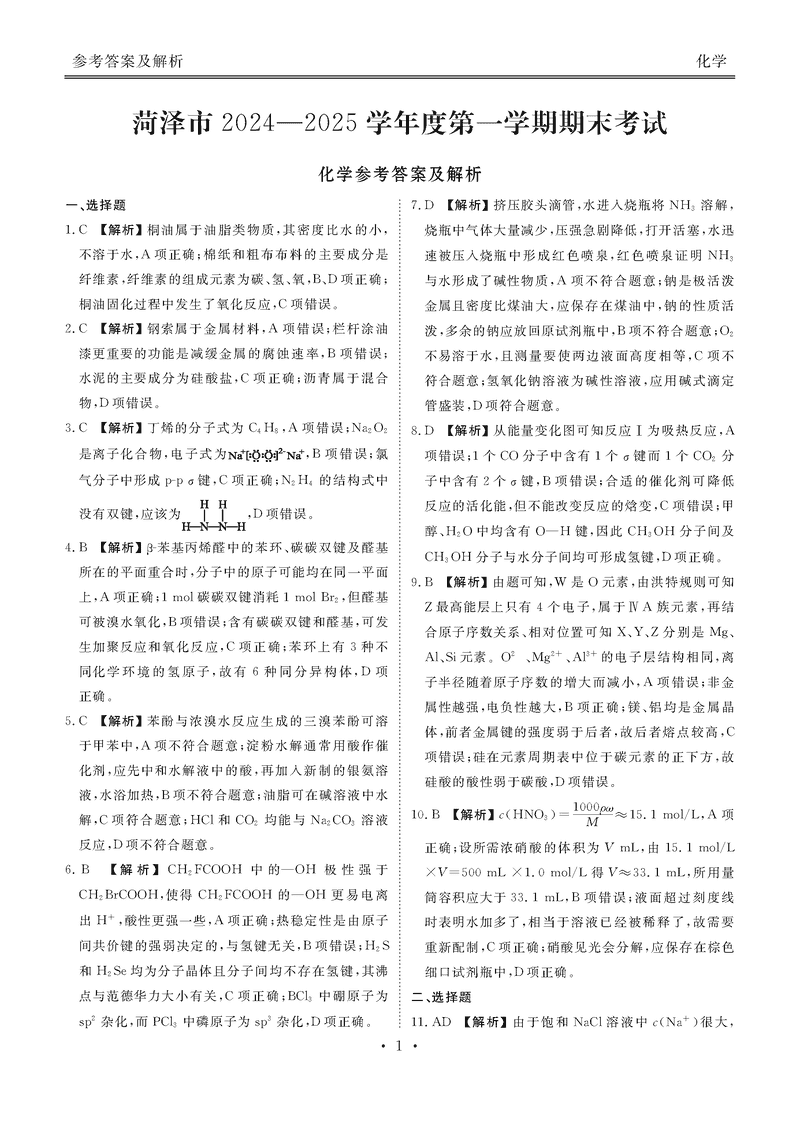 山东菏泽2024-2025学年高三上学期1月期末化学考试已于近日开考,为方便考生考后及时查看考试情况,查漏补缺、弥补不足,本文整理了试题答案解析相关信息!