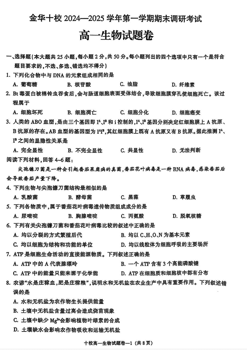 浙江金华十校2024-2025学年高一上学期期末调研生物试题及答案 时间:2025-01-27 浙江 高中生物 浙江省金华十校2024-2025学年高一上学期期末调研生物考试已于近日开考,为方便考生考后及时查看考试情况,查漏补缺、弥补不足,本文整理了试题答案解析相关信息! 生物试题及答案解析