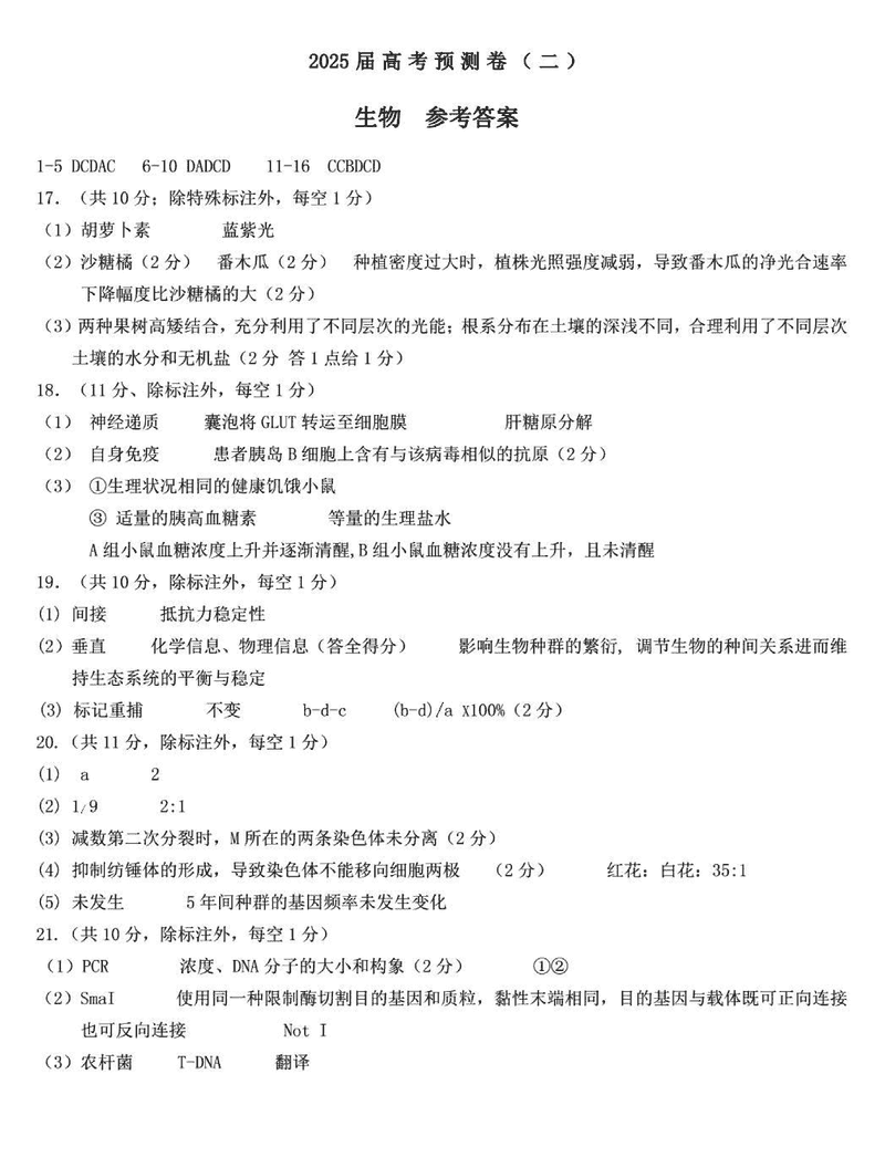 陕西省三重教育2025届高考预测卷(二)生物试题及答案