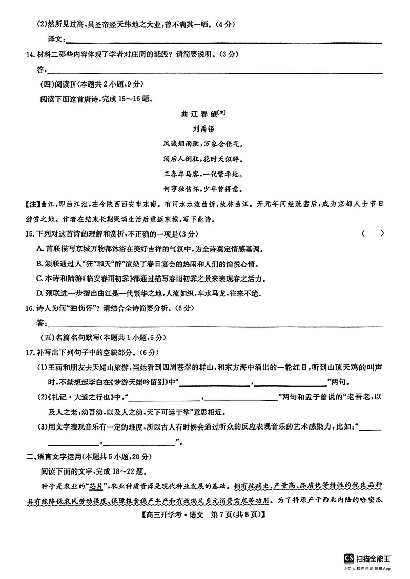 九师联盟2025届高三下学期2月开学考语文考试已于近日开考,为方便考生考后及时查看考试情况,查漏补缺、弥补不足,本文整理了试题答案解析相关信息!