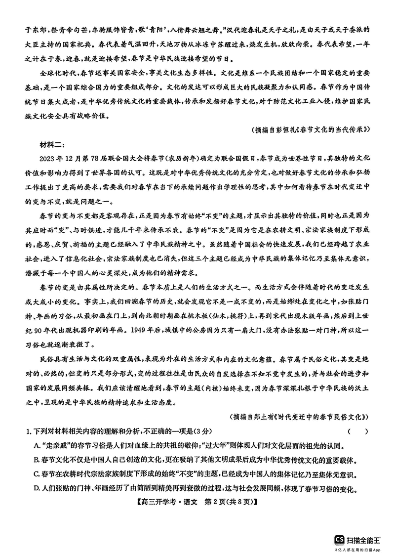 九师联盟2025届高三下学期2月开学考语文试题及答案