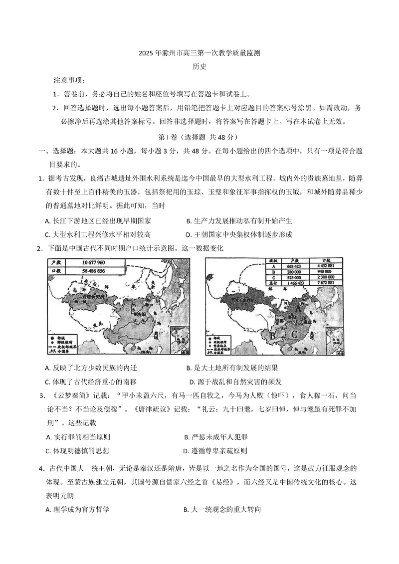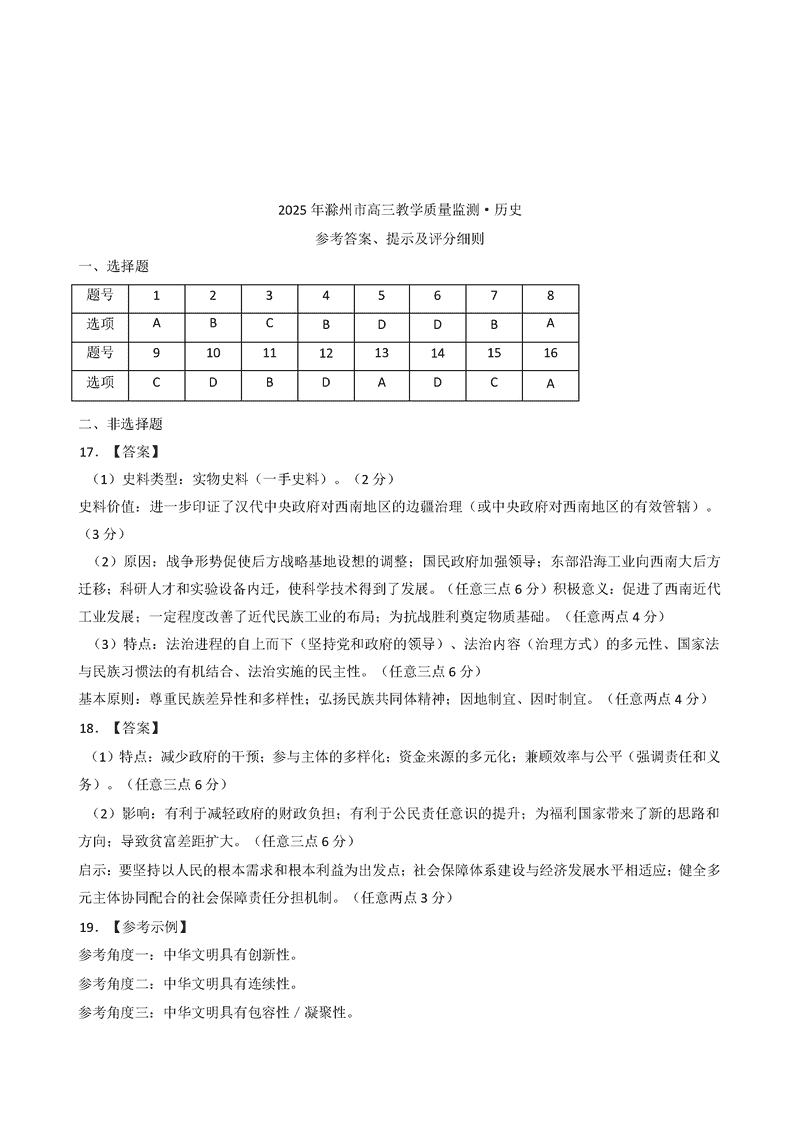 滁州市2025届高三下学期第一次教学质量监测历史试题及答案
