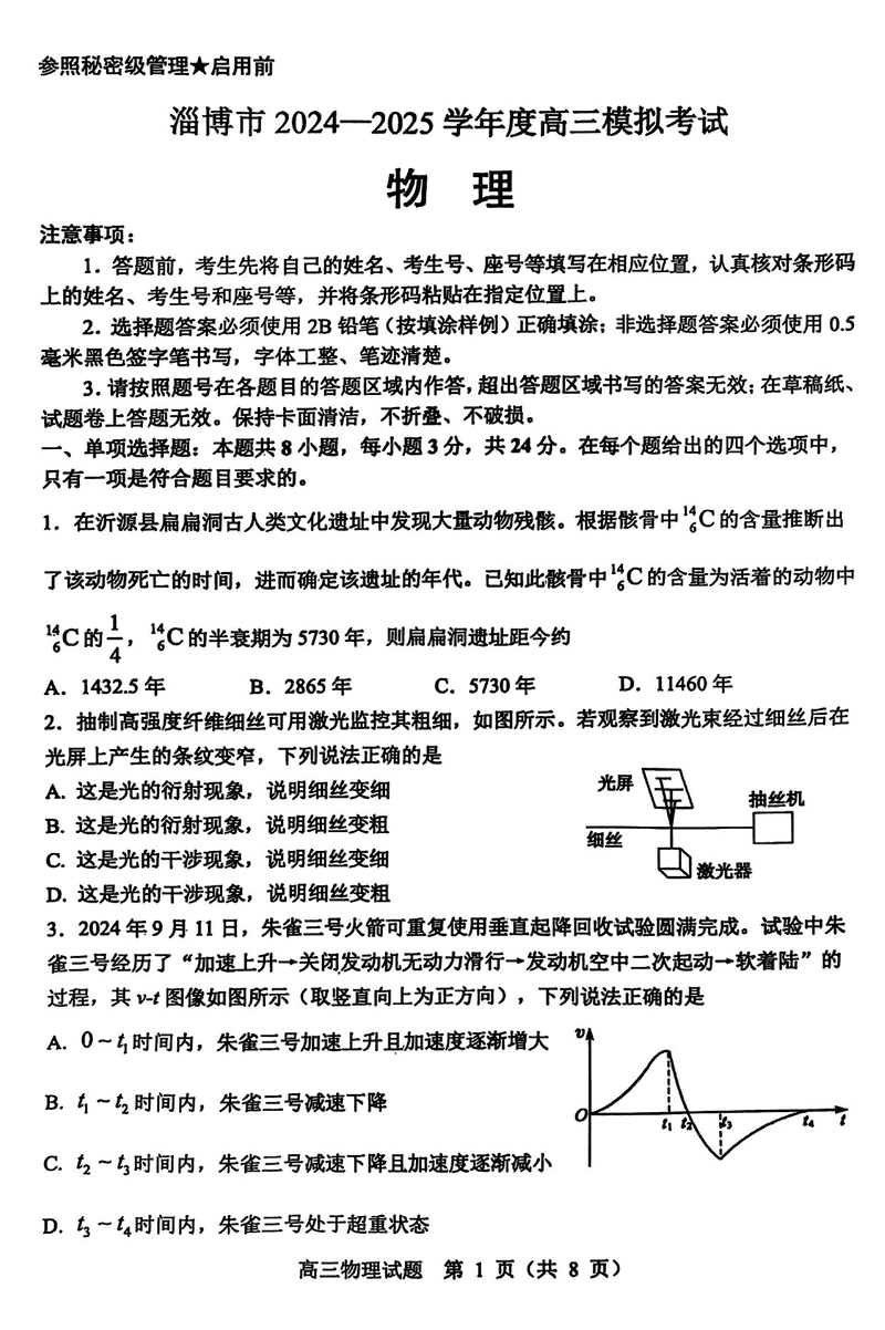 淄博市、滨州市2025届高三下学期3月一模物理试题及答案
