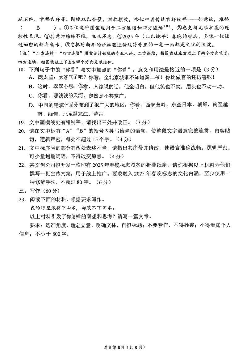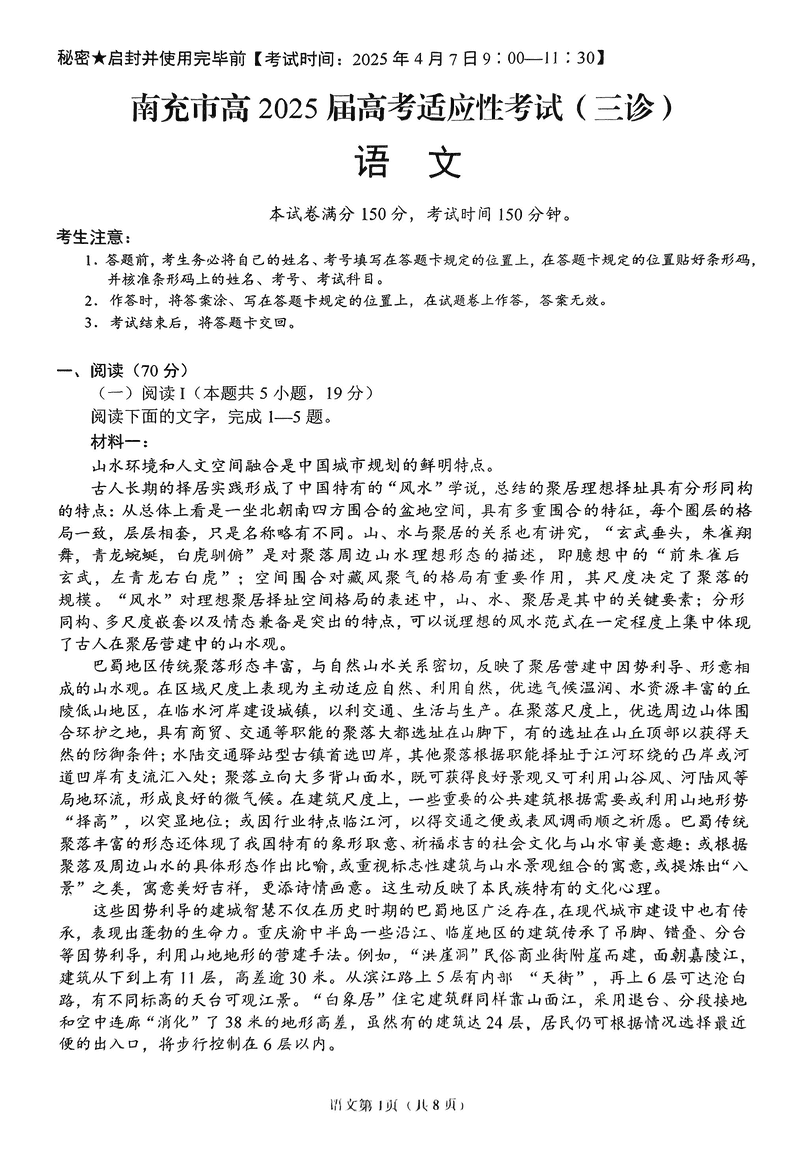 南充三诊高2025届高考适应性语文试题及答案 时间:2025-04-10 四川 语文试题 南充三诊高2025届高考适应性语文考试已于近日开考,为方便考生考后及时查看考试情况,查漏补缺、弥补不足,本文整理了试题答案解析相关信息! 汇总:南充三诊高2025届高考适应性考试试题及答案汇总 语文试题及答案解析