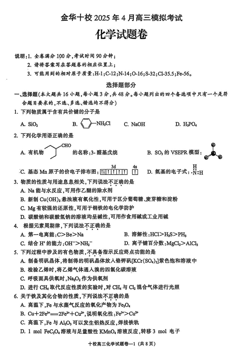 浙江金华十校2025年4月高三模考化学试题及答案