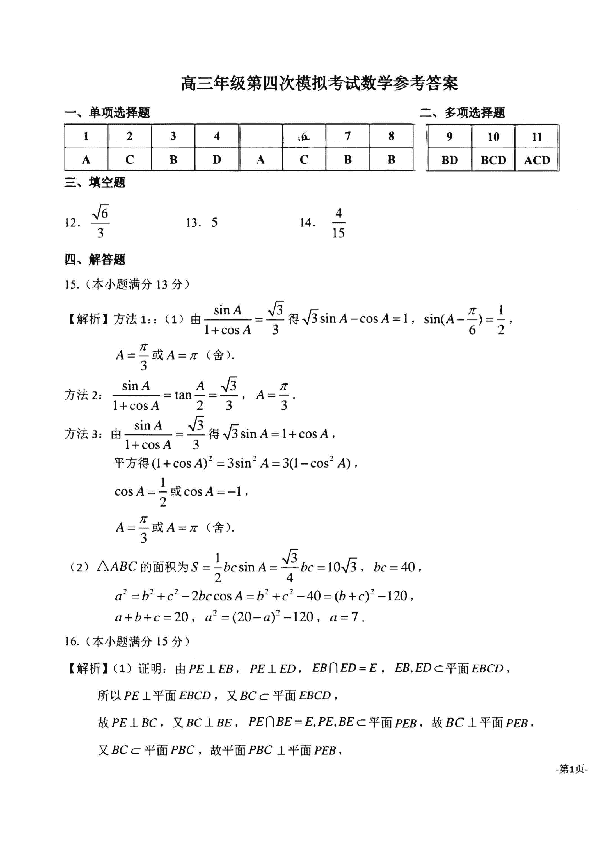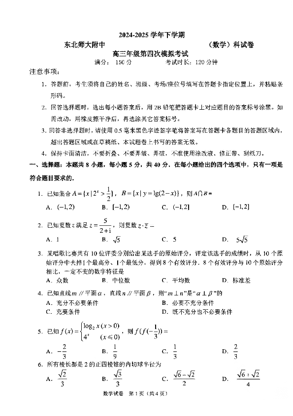东北师大附中2025高三下学期第四次模考数学试题及答案