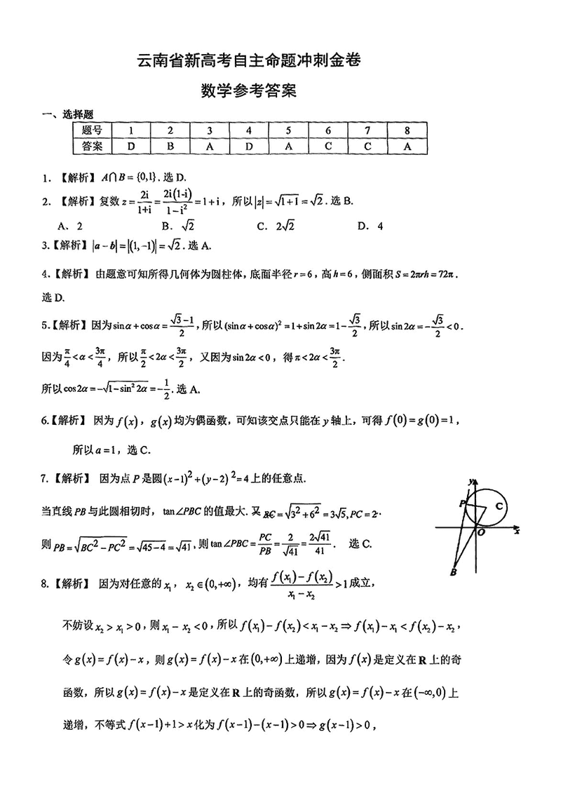 2025年云南省新高考自主命题冲刺金卷数学试题及答案 时间:2025-05-18 云南 数学试题 2025年云南省新高考自主命题冲刺金卷数学考试已于近日开考,为方便考生考后及时查看考试情况,查漏补缺、弥补不足,本文整理了试题答案解析相关信息! 汇总:2025年云南省新高考自主命题冲刺金卷试题及答案汇总 数学试题及答案解析