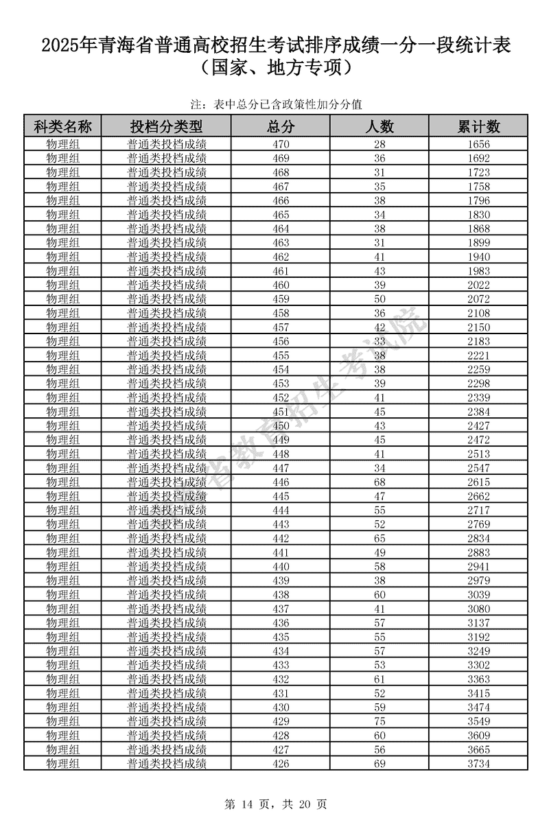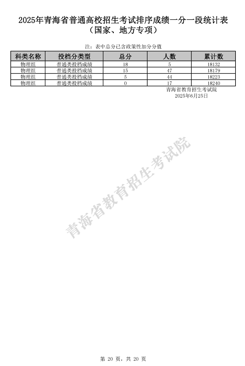 2025年青海高考排序成绩一分一段统计表(国家专项、地方专项)