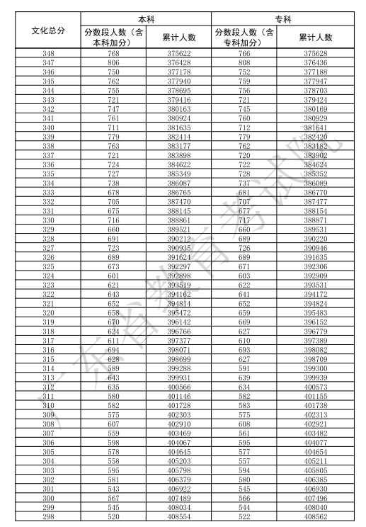 高考一分一段表是高考志愿报考的重要参考依据,一分一段表一般是指中、高考人数和分数的统计表。通过一分一段表可以知道,本省市所有考生,在某一分数上,同分值的人数有多少,还有就是截止到某分数值,一共累计有多少人。