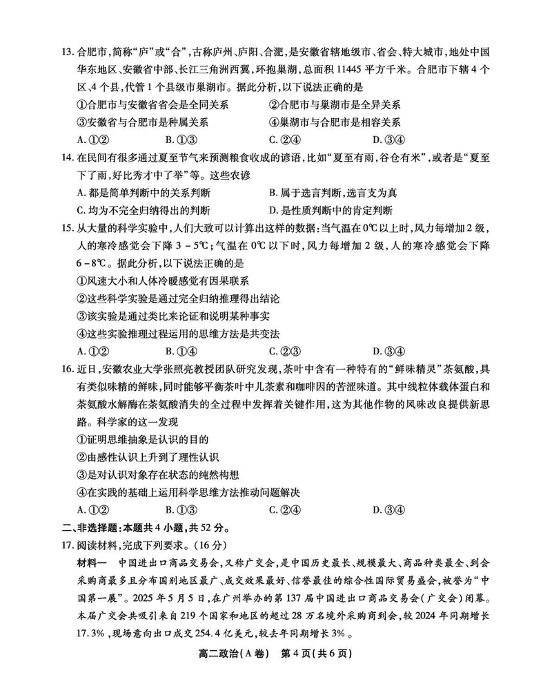安徽省江淮协作区2024-2025学年高二下学期期末政治试题及答案