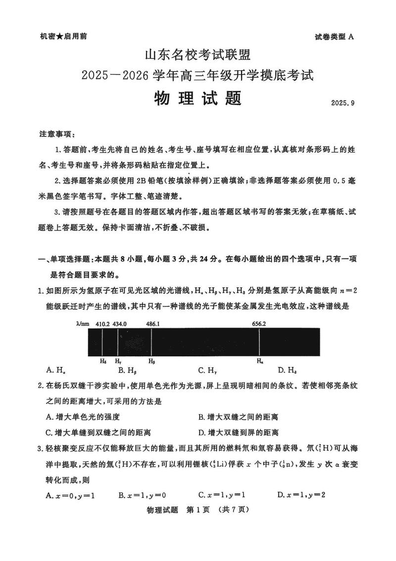 山东名校考试联盟2025-2026学年高三上学期开学摸底物理试题及答案