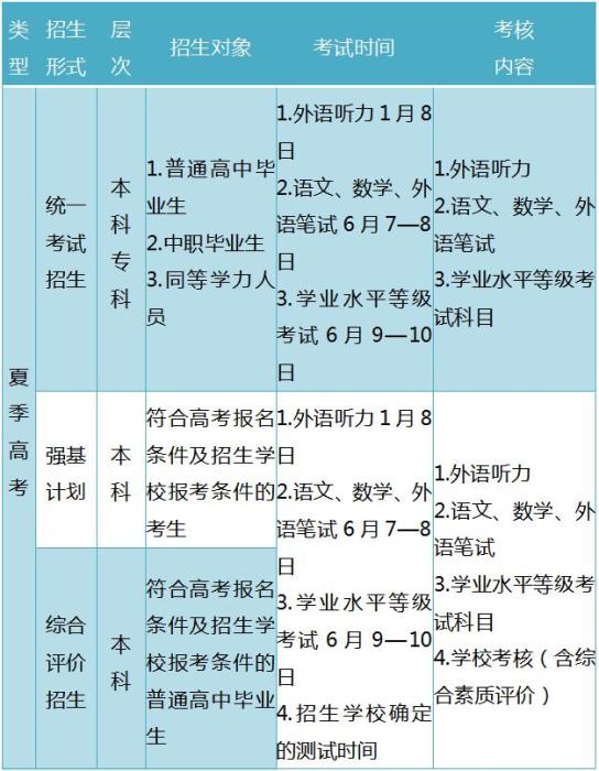 答:夏季高考分为国家统一考试和普通高中学业水平等级考试两部分。考试时间安排如下:
