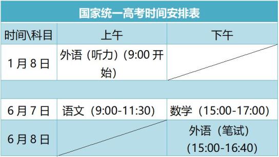 统一高考科目使用全国统一命题试卷,考试时间安排在6月7日全天和8日下午,其中语文考试时间150分钟,数学考试时间120分钟,外语(笔试)考试时间100分钟。外语(听力)考试安排在1月8日上午,连续组织两次,每次考试时长约20分钟,考试成绩取两次中的高分计入高考外语科目成绩。(2)普通高中学业水平等级考试