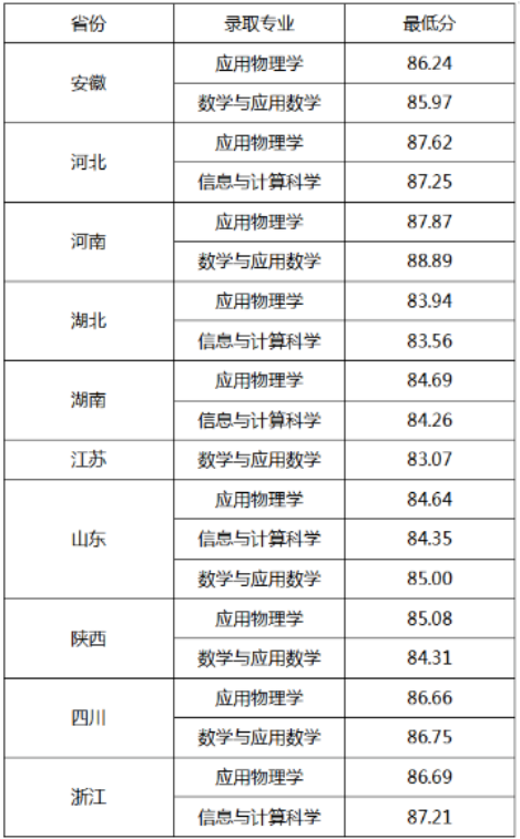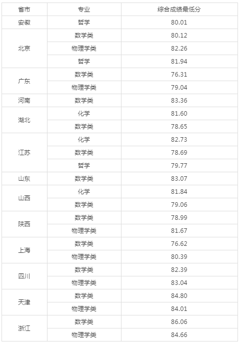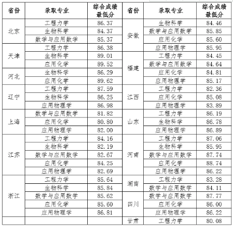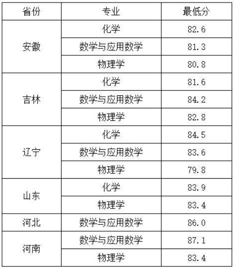 根据我校2020年强基计划考核测试情况,经学校普通本科招生领导小组审议,我校确定了2020年强基计划录取资格名单,现将各省份相关专业录取最低综合成绩公布如下。