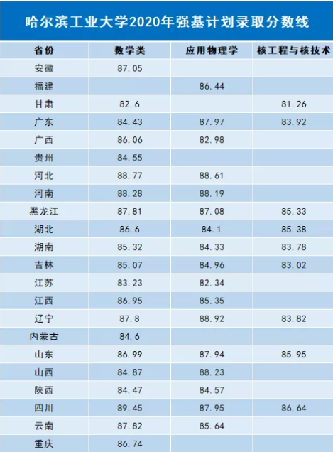 经综合面试考核,并上报我校招生委员会通过,我校2020年强基计划录取名单已经确定,考生可登录哈尔滨工业大学强基计划招生报名平台(网址:https://bm.chsi.com.cn/jcxkzs/sch/10213)查询录取结果。同时将我校2020年强基计划分省分专业录取综合成绩最低标准公布如下。