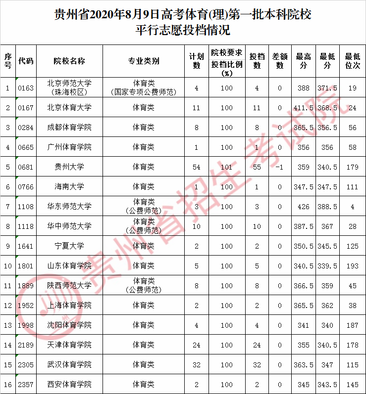 2020贵州高考体育第一批本科院校投档分数线 时间:2020-08-10 10:42 分数线 目前,同学们和广大家长朋友们非常关心的2020贵州高考体育第一批本科院校平行志愿投档分数线已经公布。下面小编为大家详细介绍一下,供大家参考。贵州高考体育第一批本科院校投档分数线