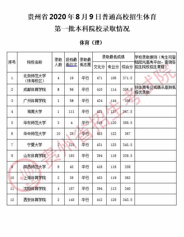 2020贵州高考体育第一批本科院校录取情况 时间:2020-08-10 10:54 分数线 目前,同学们和广大家长朋友们非常关心的2020贵州高考体育第一批本科院校录取情况已经公布。下面小编为大家详细介绍一下,供大家参考。贵州高考体育第一批本科院校录取情况