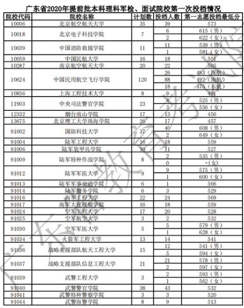以下,是广东省2020年高考录取军校(需军检)招生投档录取分数线: