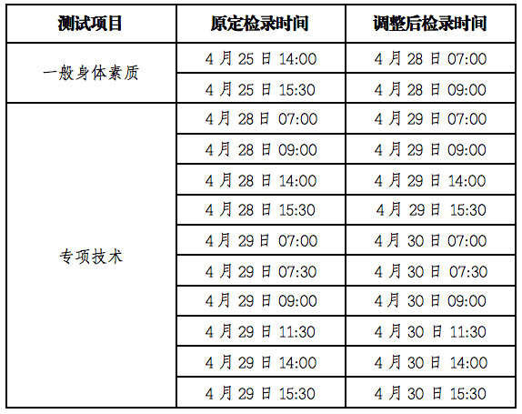 1.原定于4月25日下午14:00、15:30检录参加一般身体素质测试的考生,检录时间分别调整至4月28日上午7:00、9:30。其余考生一般身体素质测试安排不变。