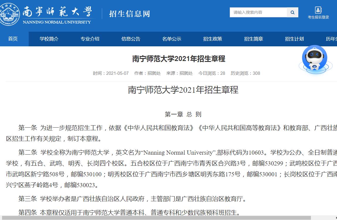 第四条 本章程仅适用于南宁师范大学普通本科、普通专科和少数民族预科班招生。