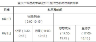 2021年重庆普通高中学业水平选择性考试科目由我市自主命题,考试时间安排在6月8日上午和6月9日全天,每科考试时长均为75分钟。