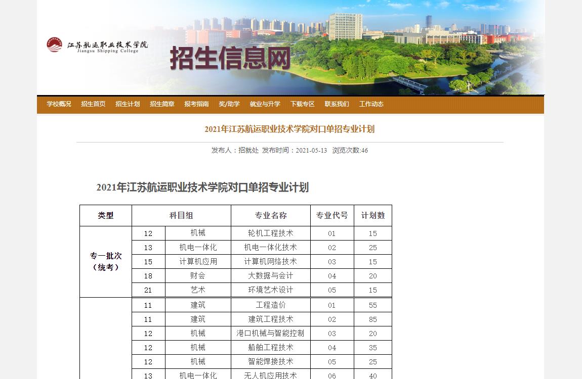 2021年江苏航运职业技术学院对口单招专业计划