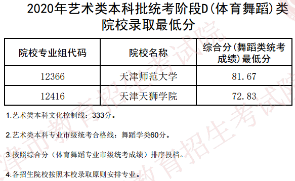 2020年艺术类本科批统考阶段D(体育舞蹈)类院校录取最低分公布,下面是各高校统考录取最低分,供参考。
