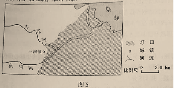 圩田是在低洼地筑堤围出的田地。图5所示圩田海拔 6~7米,种植庄稼;巢湖多年平均水位8.03米。据记载,在清朝嘉庆年间,三河镇濒临巢湖。