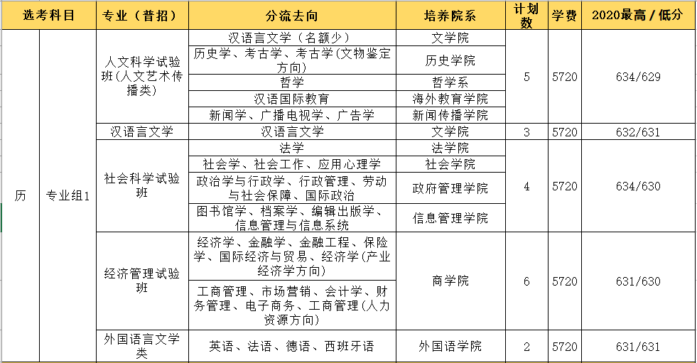 (1)“历史+不限”专业组共投放20个一般录取计划名额,包括人文科学试验班、汉语言文学、社会科学试验班、经济管理试验班、外国语言文学类等5个大类专业;