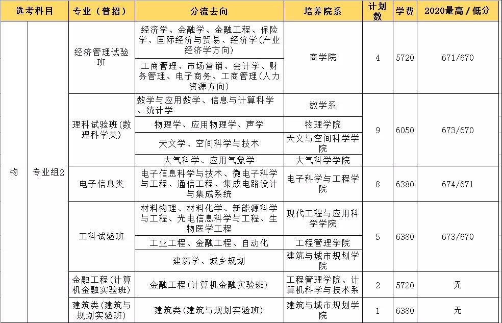 (2)“物理+不限”专业组共投放29个一般录取计划名额,包括经济管理试验班、数理科学类、电子信息类、工科试验班、金融工程(计算机金融实验班)(含双学士学位)、建筑类(建筑与规划实验班)等6个大类专业;
