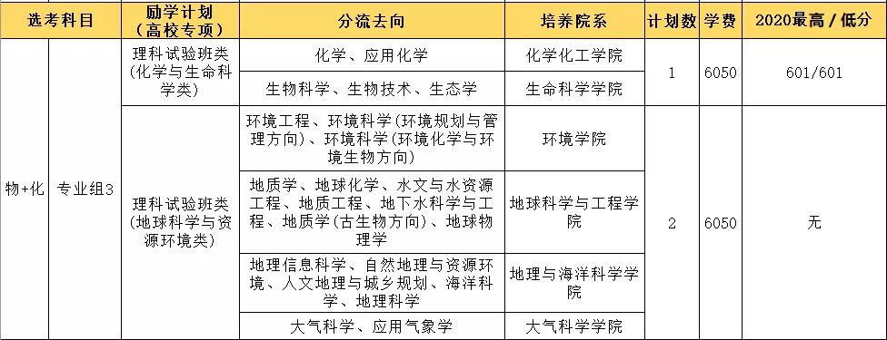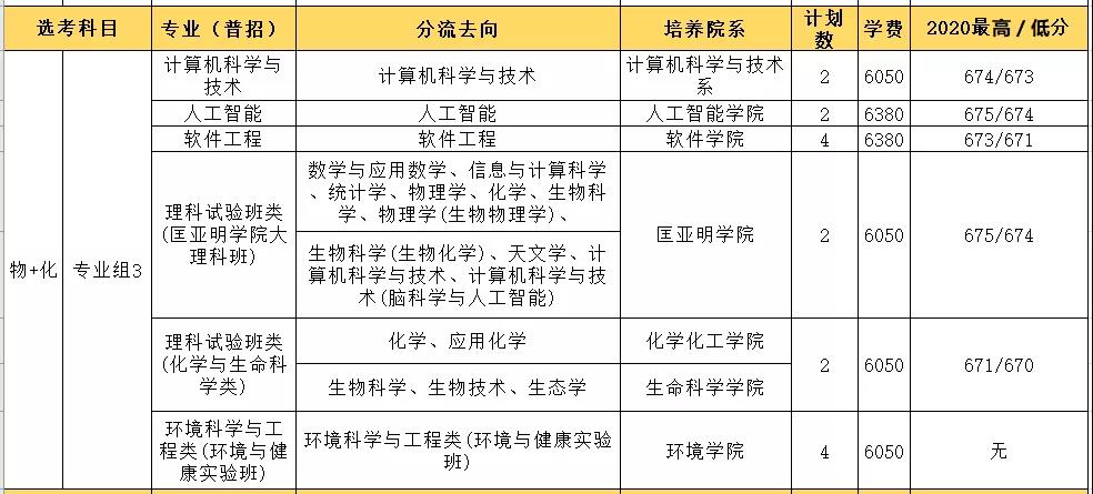 (3)“物理+化学”专业组共投放16个一般录取计划名额,包括计算机科学与技术、人工智能、软件工程、大理科班、环境科学与工程类(环境与健康实验班)等6个大类专业;