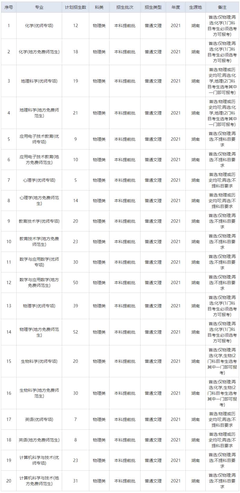 湖南师范大学2021年招生计划