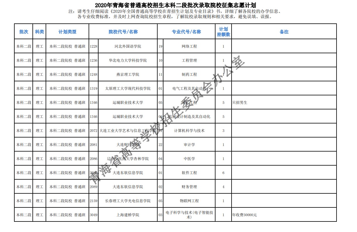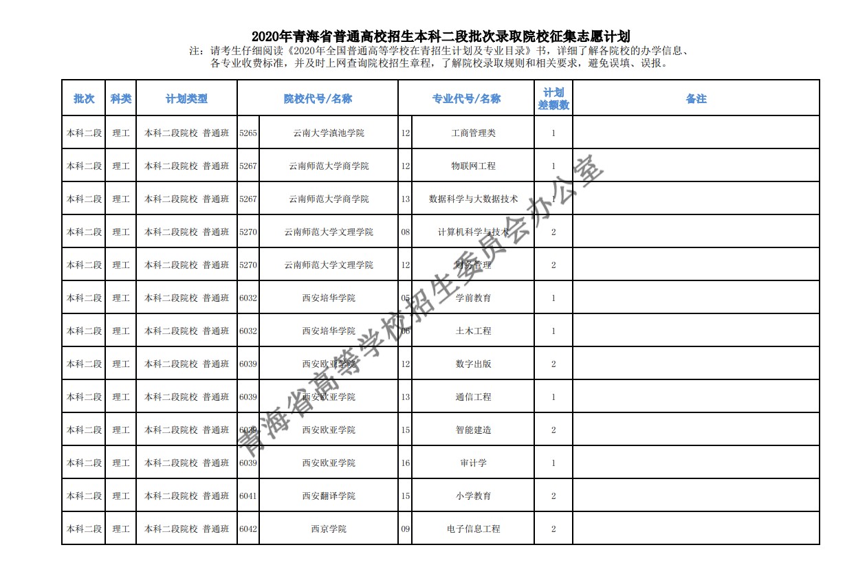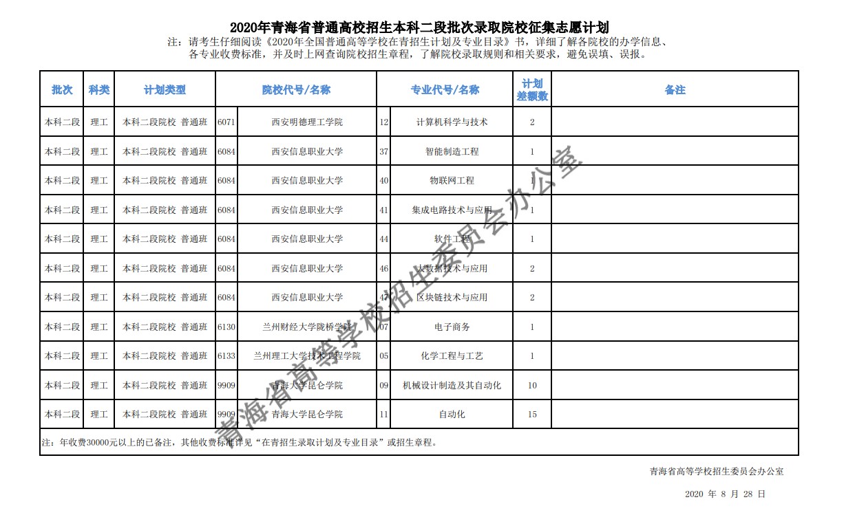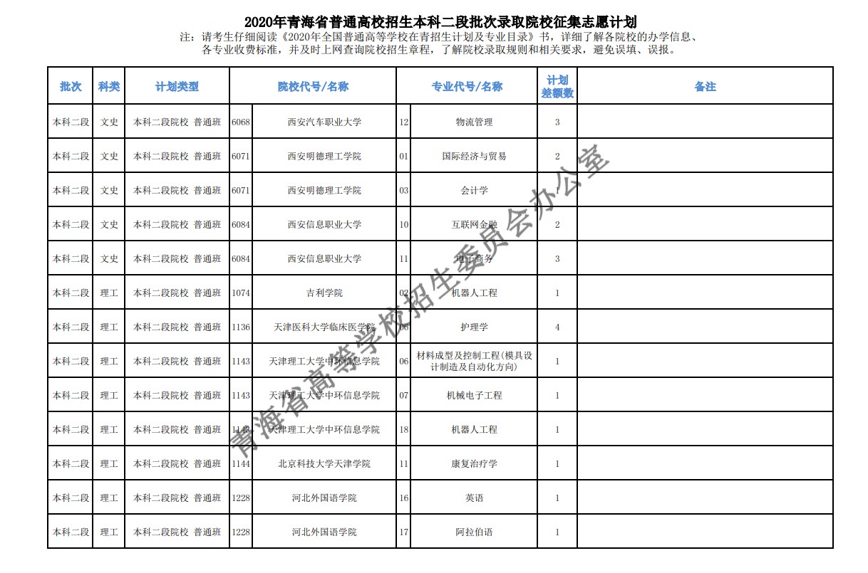 2020年青海高考本科二批征集志愿填报时间及招生计划