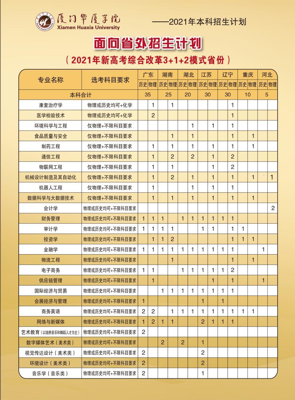 厦门华厦学院2021年面向新高考综合改革“3+1+2”模式省份分专业招生计划(广东、湖南、湖北、江苏、辽宁、重庆、河北)