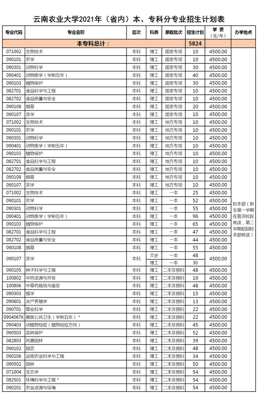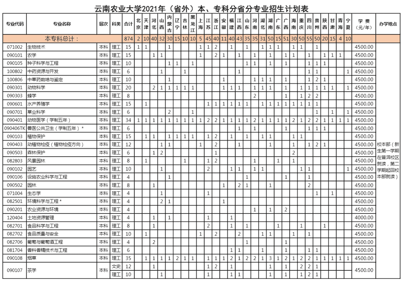 2021年云南农业大学招生计划已经公布,以下是云南省及全国各专业招生人数,这是填报志愿时非常重要的参考数据,供大家参考,如有变动,以学校官方公布为准: