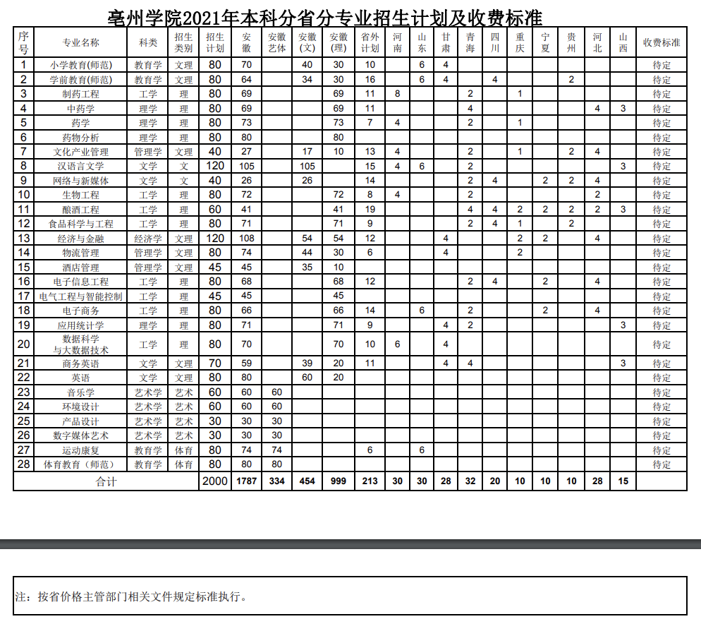 亳州学院2021年本科分省分专业招生计划及收费标准