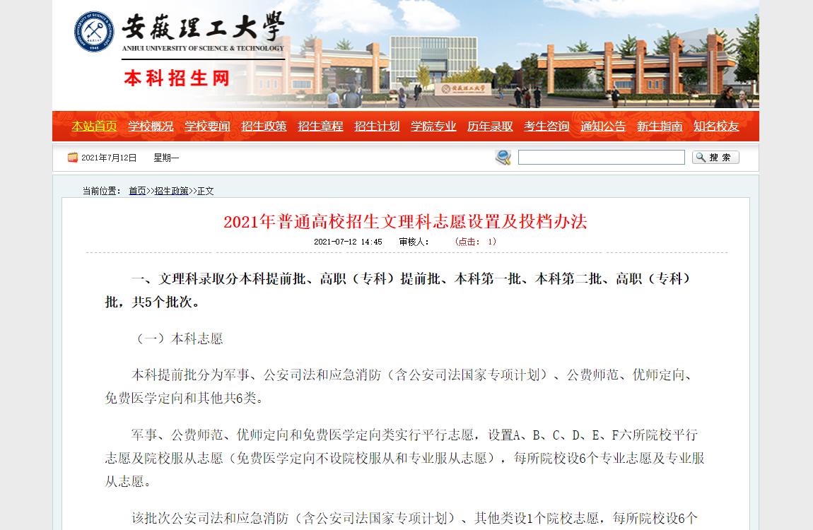 安徽理工大学2021年普通高校招生文理科志愿设置及投档办法