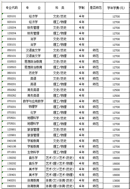 普通类专业学费为12500-12700元/年,师范类专业学费为12700-18000元/年,艺术类专业为18000元/年,体育类专业为13000元/年。