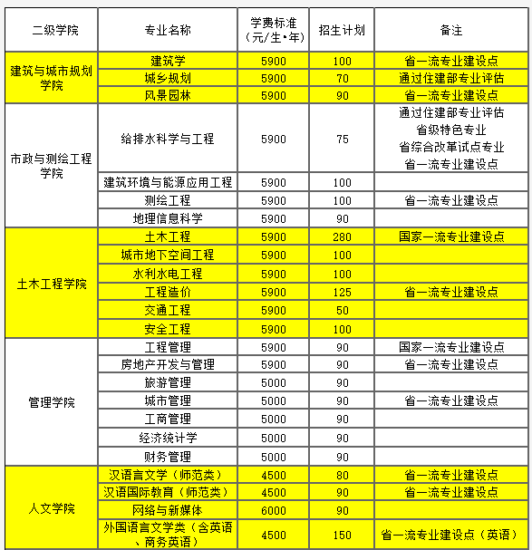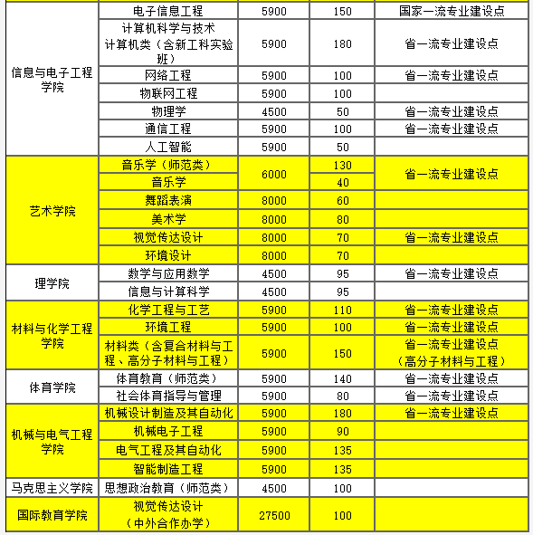 普通类专业学费为4500-6000元/年;艺术类专业学费为6000-8000元/年;体育类专业学费为5900元/年;中外合作办学类专业学费为27500元/年。